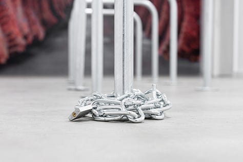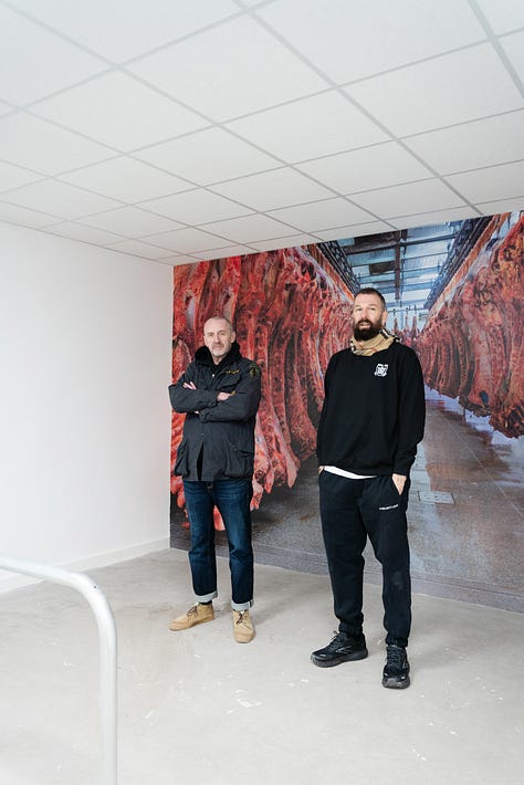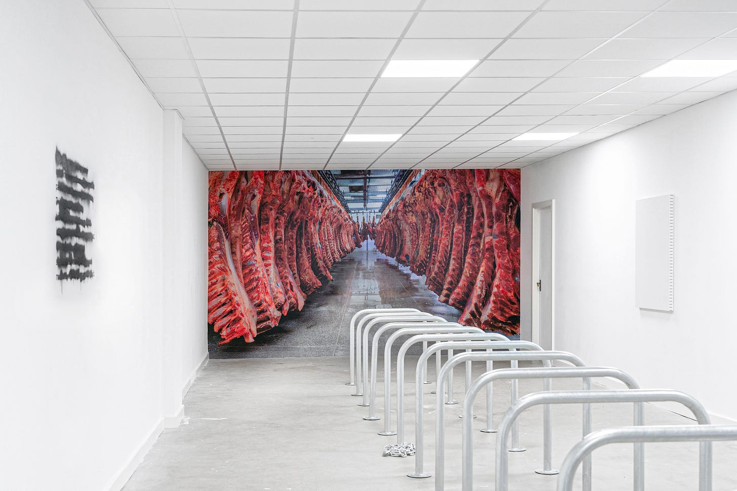 In Richie’s world, life exists on the edge, and death is an inescapable truth. A stock image of carcasses hanging in an abattoir decorates the space. Is it background noise or a glimpse behind the curtain: exposing the mechanics of consumption and commodification?